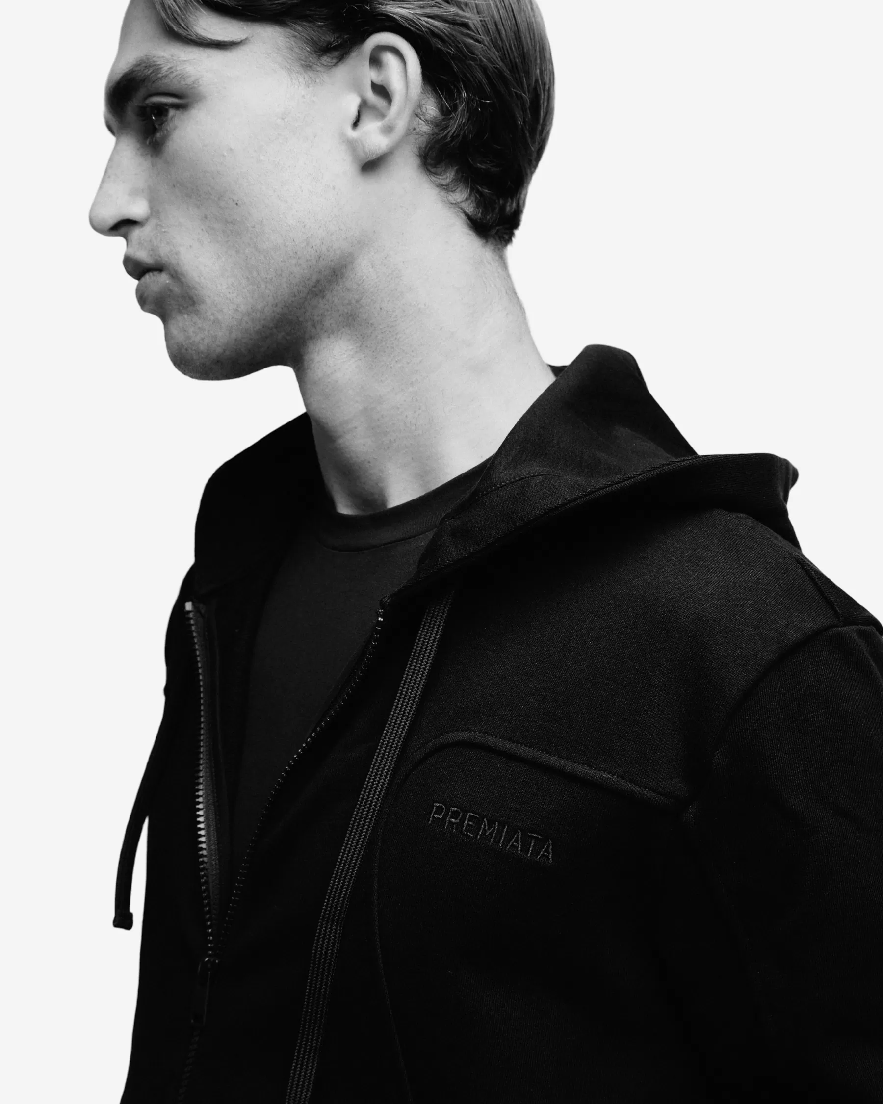 Realizzato in jersey felpa di cotone Gressoney. Felpa uomo con cappuccio e zip, vestibilità Comfort.Ricamo scritta Pre…